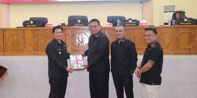 Selesai membacakan, Wakil Bupati Dony Lumenta kemudian menyerahkan dokumen kepada Ketua DPRD Tonny Tumbelaka di dampingi Wakil Ketua Febrianto Tangahu dan Sulhan Manggabarani.